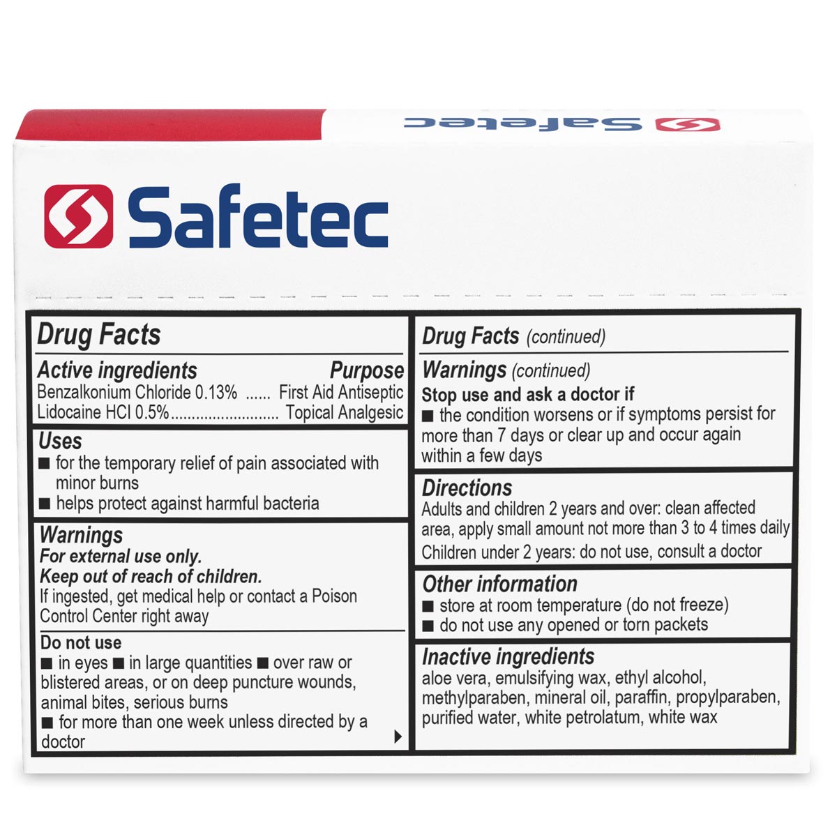 Safetec® First Aid & Burn Cream Helps relieve pain and protects cuts, scrapes and burns against contamination. First Aid & Burn Cream is non-greasy and non-irritating. Keep them in your purse, backpack, pocket or glove compartment. Great for on the spot use at home or at work. Packaged in convenient 25 ct. dispenser box. Contains: Benzalkonium Chloride and Lidocaine HCL.